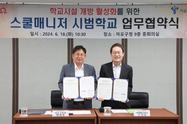 이날 협약식에는 박강수 마포구청장과 조희연 서울시 교육감, 구청과 교육청 업무 관계자들이 참석해 스쿨매니저 사업 내용을 공유하고 협약을 체결하는 시간을 가졌다.