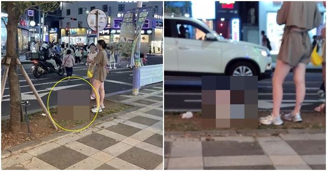 글쓴이가 공개한 사진에는 바지와 속옷을 내린 한 아이가 길거리 화단에 주저앉아 대변을 보는 듯한 모습이 담겨 있다. 아이의 옆에는 아이 엄마로 추정되는 여성이 아무렇지 않게 팔짱을 끼고 있다.