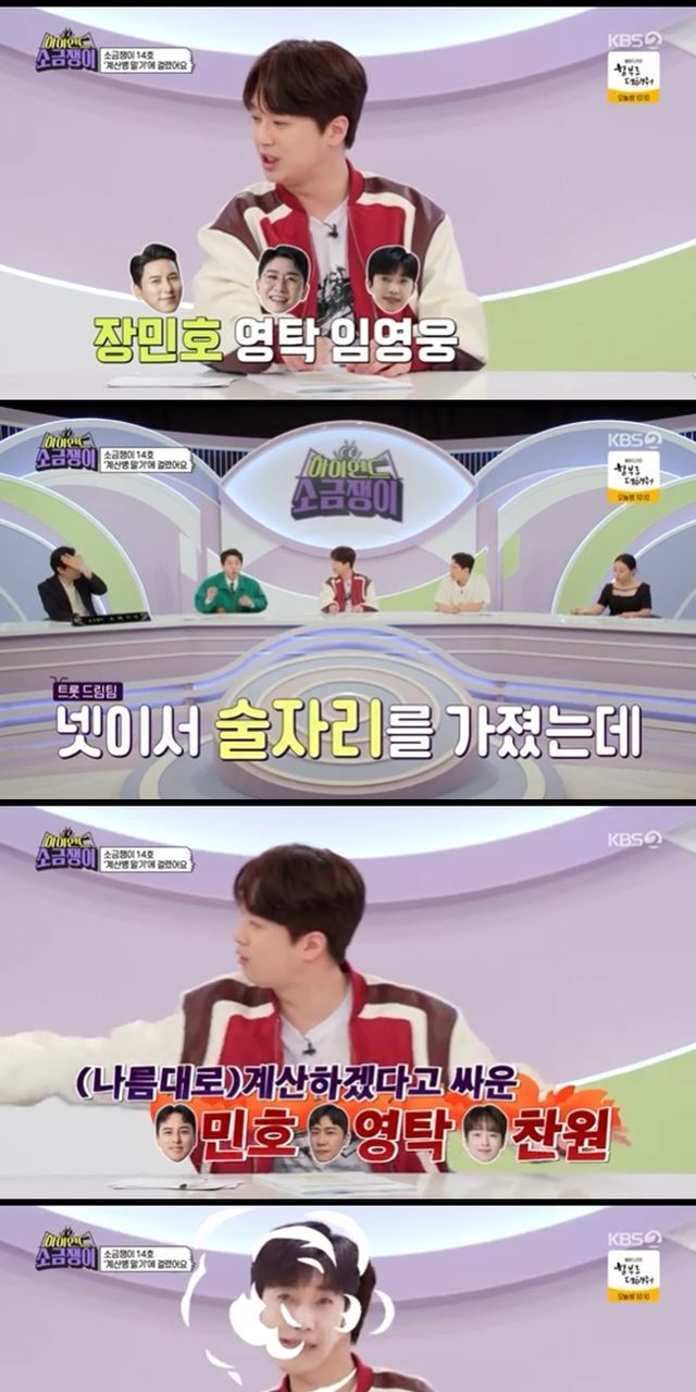 이찬원은 "내가 한다"라면서도 "그런데 이런 적이 있다. 장민호 씨와 영탁 씨와 임영웅 씨와 저와 이렇게 네명이 술을 먹었다"라고 떠올렸다.
