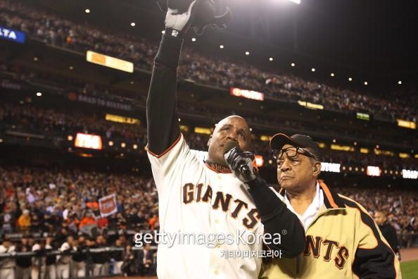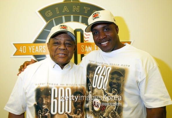 2007년 통산 756홈런을 친 후 배리 본즈가 대부 윌리 메이스(오른쪽)와 함께 한 모습. 사진=게티이미지