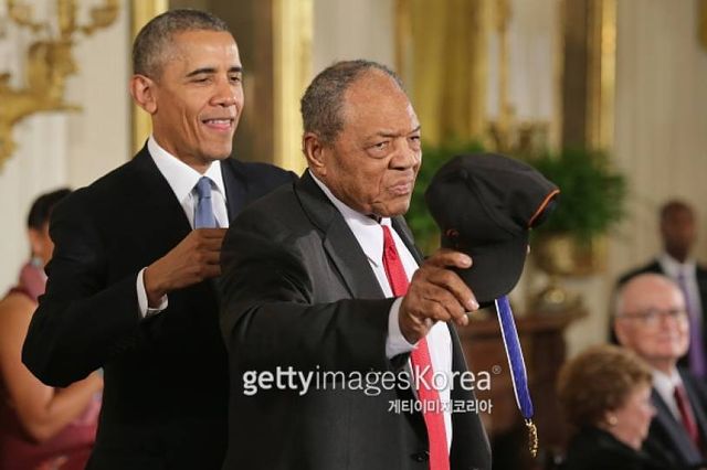 2015년 백악관을 방문해 버락 오바마 당시 대통령에게 대통령 자유의 메달을 받은 윌리 메이스의 모습. 사진=게티이미지