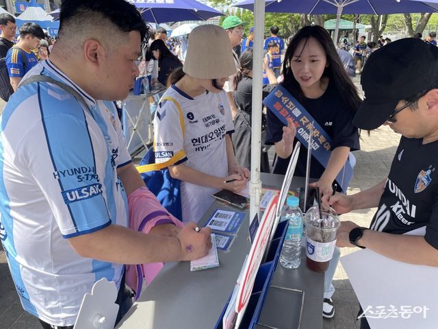 스포츠토토 현장 행사에서 불법스포츠도박 근절 서명지에 서약하고 있는 축구팬들. 사진제공 | 스포츠토토코리아