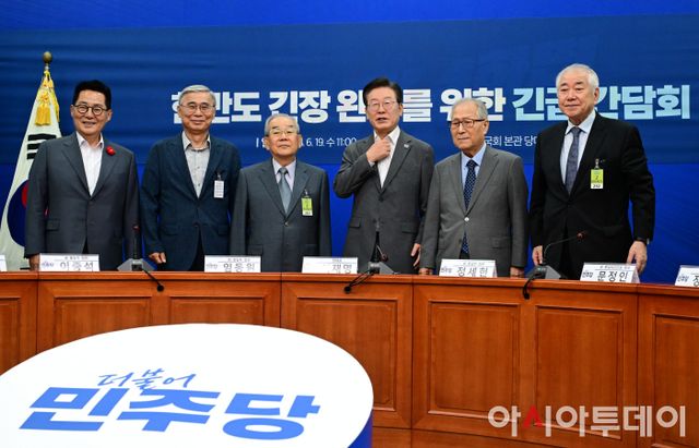 아시아투데이 이병화 기자 = 이재명 더불어민주당 대표가 19일 국회에서 열린 한반도 긴장 완화를 위한 긴급 간담회에 앞서 기념촬영을 하고 있다. 왼쪽부터 박지원 전 국정원장, 이종석, 임동원 전 통일부 장관, 이재명 대표, 정세현 전 통일부 장관, 문정인 전 대통령 통일외교안보 특보.