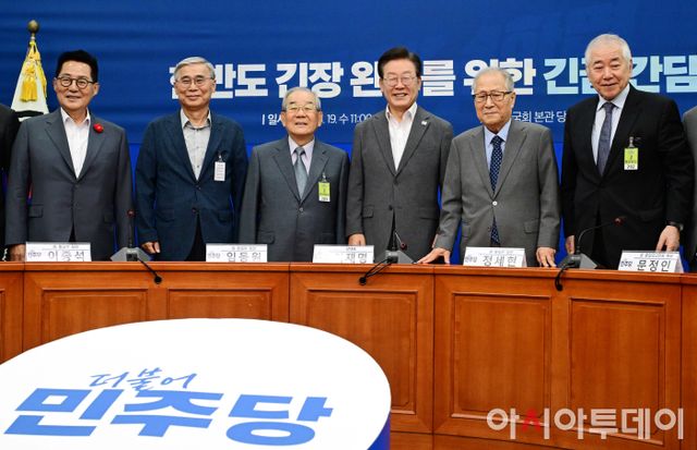 아시아투데이 이병화 기자 = 이재명 더불어민주당 대표가 19일 국회에서 열린 한반도 긴장 완화를 위한 긴급 간담회에 앞서 기념촬영을 하고 있다. 왼쪽부터 박지원 전 국정원장, 이종석, 임동원 전 통일부 장관, 이재명 대표, 정세현 전 통일부 장관, 문정인 전 대통령 통일외교안보 특보.