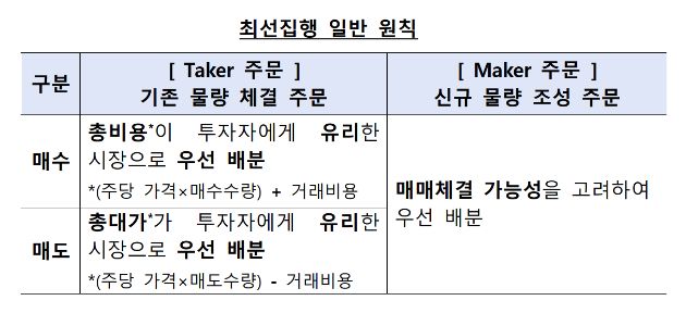 최선 집행 일반원칙에 따르면 시장가 주문(Market Order) 등 기존 물량 체결 주문(Taker Order)은 총비용 또는 총 대가를 기준으로 주문 배분한다. 지정가 주문(Limit Order) 중 미체결 물량 등 신규 물량 조성 주문(Maker Order)은 매매체결 가능성을 우선하는 집행시장 배분 기준을 수립해야 한다. 시장가 주문의 경우 KRX보다는 넥스트레이드로 주문이 배정될 가능성이 높고, 대량매매 등의 경우에는 KRX로의 배정 가능성이 높다는 것이다.