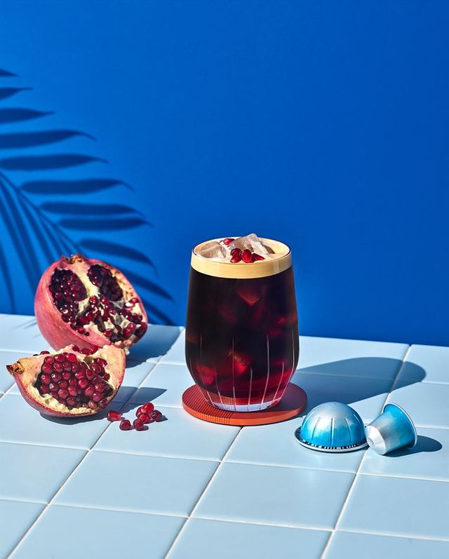 매혹적인 석류와 상쾌한 아이스 커피의 랑데부.