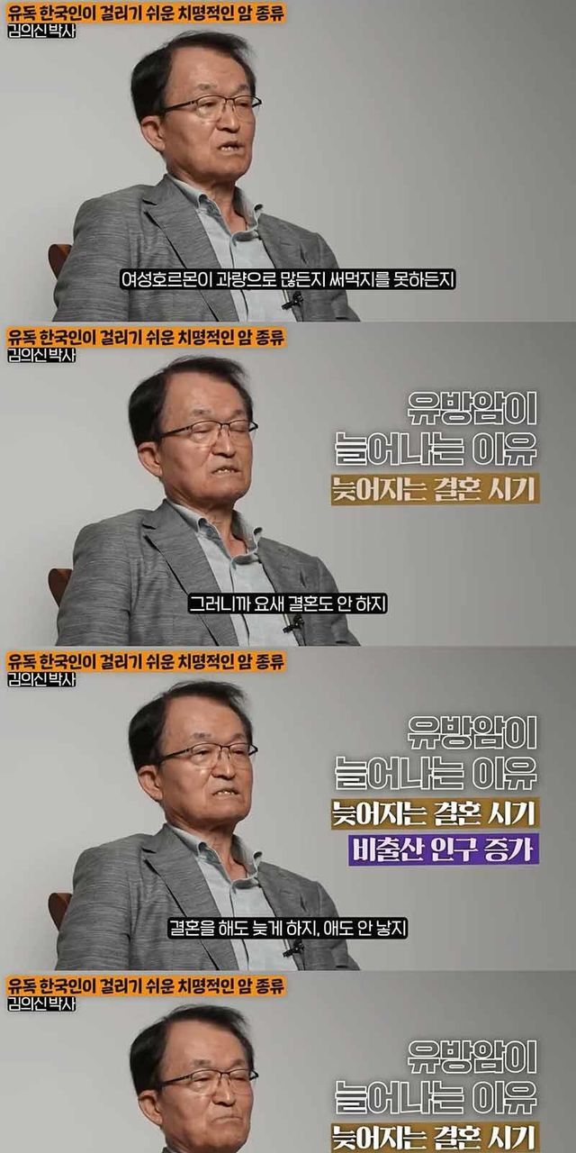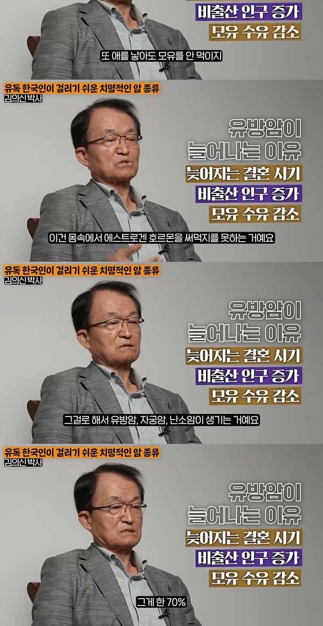 그러면서 “결혼을 해도 늦게 한다. 애도 안 낳는다. 애를 낳아도 모유를 안 먹인다”라며 “그러면 몸속에서 에스트로겐 호르몬을 써먹지 못한다. 그래서 유방암, 자궁암, 난소암이 생기는 것이다. 그게 (유방암 발병 원인의) 70%다”라고 말했다.