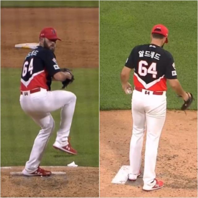 팔 각도가 낮은 알드레드는 왼손 스리쿼터에 가깝다. 만약 1루 쪽 투수판을 밟고 던진다면, 왼손 타자 입장에선 흡사 등 뒤에서 공이 날아오는 것처럼 느낄 수 있다. 알드레드의 두 번째 등판(14일 수원 KT 위즈전)을 중계한 장성호 KBS N 스포츠 해설위원은 "1루 쪽을 밟고 던지는 게 알드레드 투구 폼에 최적화한 것으로 볼 수 있다"고 말했다.