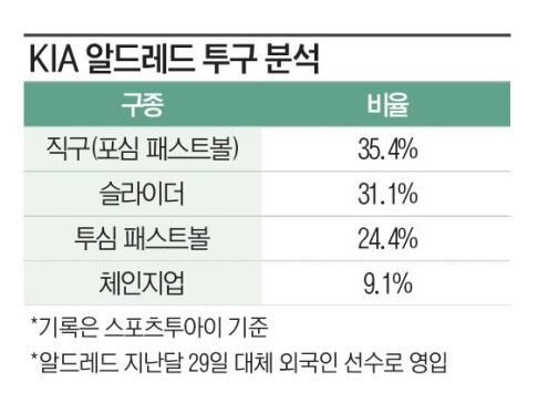 정재훈 KIA 투수 코치는 "알드레드가 미국에서 (투수판의) 이쪽(1루)도 저쪽(가운데)도 다 해보지 않았을까 싶다. 결과적으로 왼손 타자 상대로 스위퍼(슬라이더)만 계속 쓸 게 아니라 투심도 던져야 하니까 그런 걸 고려한 결과물이지 않을까 한다"며 "1루를 밟고 던지면 스위퍼가 좋아지겠지만, 투심을 던지는 게 불편해지니까 중앙을 밟는 거 같다"고 말했다.