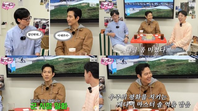 이정재는 “요즘 유튜브를 통해 먹방 콘텐츠를 즐겨본다”라는 근황과 함께 “주로 고기 쪽을 많이 본다. 소고기, 돼지고기 안 가린다”라는 말로 현장의 웃음을 자아냈다. 이어 “내가 먹방 프로를 새벽까지 볼 줄 몰랐다”라며 “어느덧 보면 새벽 3시다. 6시에 일어나서 촬영 가야 하는데, 침대에 옆으로 누워서 계속 먹방만 본다”라며 웃었다. 이에 유재석과 양세찬은 “다 똑같구나. 나만 그러는 줄 알았는데”, “난 면 쪽을 많이 본다. 사람 사는 거 다 똑같다”라며 폭풍 공감했다.