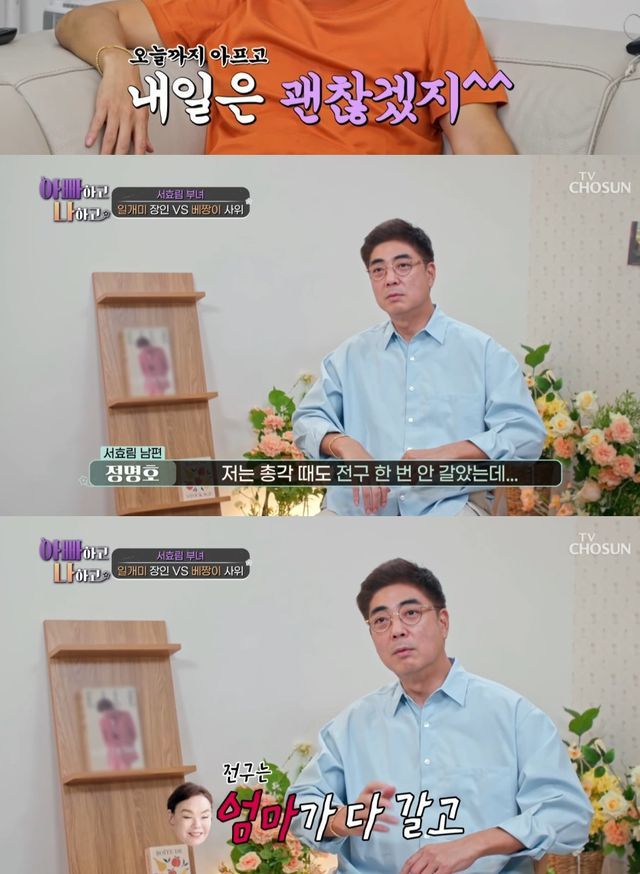 또한 정명호는 직접 화장실 보수에 나선 '70대' 장인어른을 도우라는 서효림에게 "한 손 밖에 못 뻗는다. 오십견 왔다", "최대한 쉬어야 내일 골프치러 간다", "오늘까지 아플 것 같다"며 이를 거절했다.