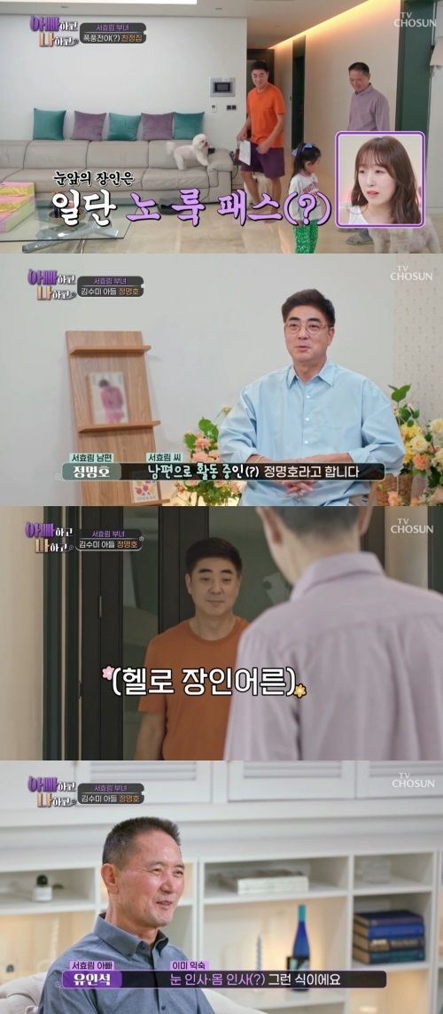 이어 방송에는 서효림이 5분 거리에 있는 친정집을 찾았고, 남편 정명호 또한 딸을 데리고 등장했다. 하지만 정명호는 장인을 보고도 인사를 하지 않고 시선도 마주치지 않아 모두의 의아함을 자아냈다.