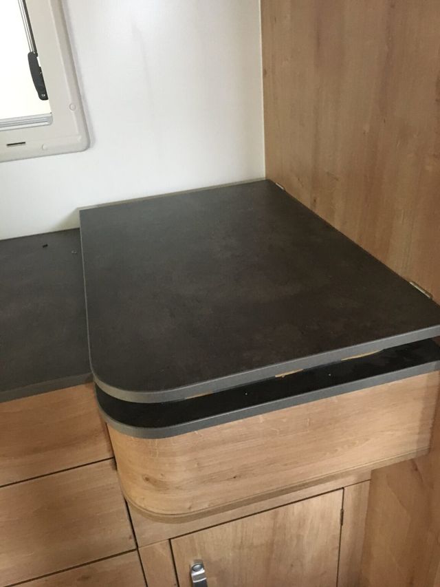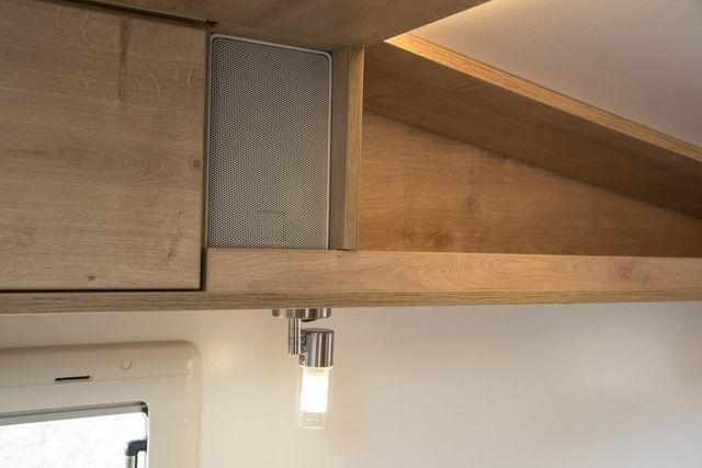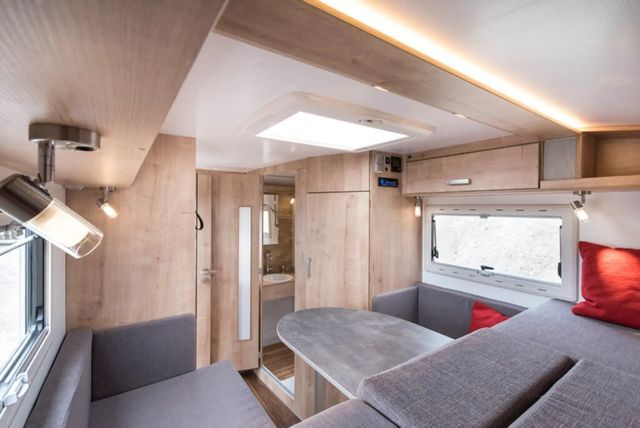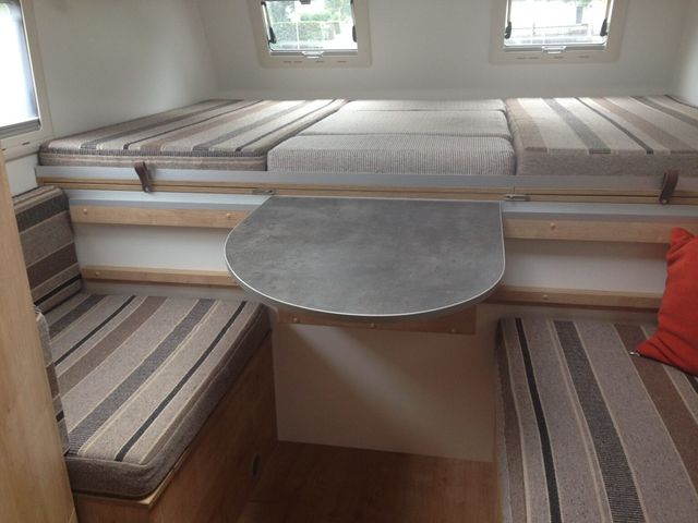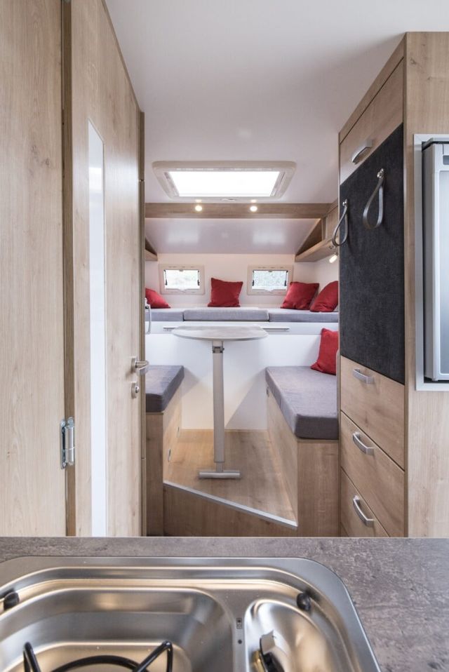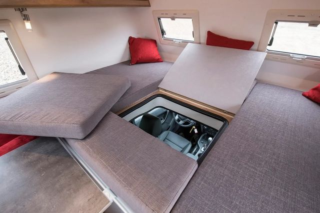 침대 아래에는 수납 기능이 있는 벤치와 뒤집어 사용하는 2인용 테이블이 있다. 만약 날씨가 좋지 않다면 캠핑카 내에서 식사하거나, 휴식을 취할 수 있다. 식당 공간은 단일 침대로 변환할 수 있는 옵션을 갖췄다.