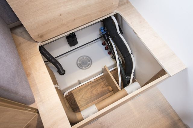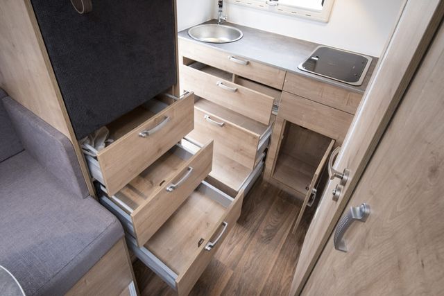 주방은 뒷좌석 쪽 문 바로 안쪽에 있다. 요리 재료들을 보관할 수 있는 충분한 공간이 갖춰져 있고, 싱크대와 2구 가스스토브 또한 구비됐다. 반대쪽 벽에 있는 캐비닛에는 80리터 소형 냉장고가 있다.