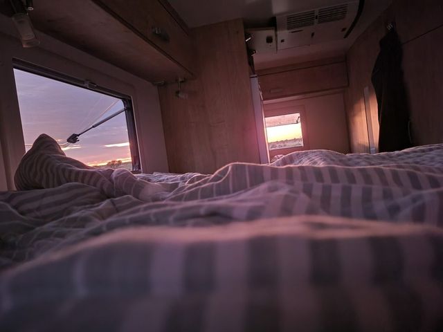 2m x 1.3m 크기의 알코브 침대는 프롤리 스프링 시스템을 사용해 편안함을 극대화했다. 최대 세 명까지 편안하게 잘 수 있으며 침대 위에는 책, 전화기, 물병 등 필수품을 보관할 수 있는 나무 선반이 두 개 있다.