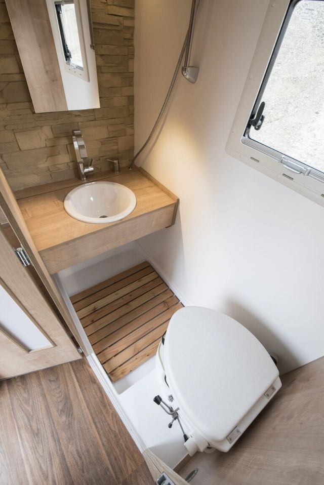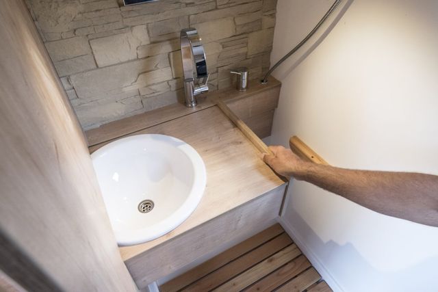 변기와 샤워 시설이 갖춰진 욕실도 캠핑카 내부에서 찾아볼 수 있다. 세면대는 벽으로 밀어 넣도록 제작돼 공간 활용성을 높였다.