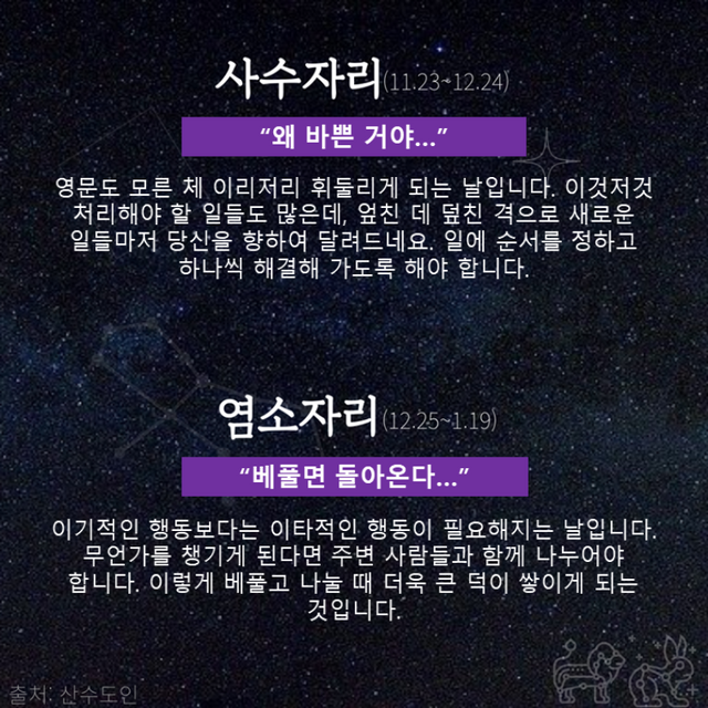 마음 속에 별자리가 가득 들어와 있는 듯 신비로운 느낌입니다. 우연한 만남과 뜻밖의 행운이 발생하게 되는 때이니 약간의 예지력마저 생긴 느낌이라고 보여지네요. 평상시에는 보이지 않던 것들이 보이게 되는 날이라고 할 수 있습니다.