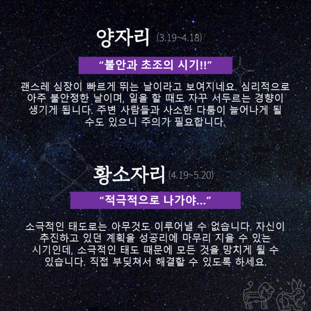 괜한 걱정으로 피로감을 심하게 느낄 수도 있는 날입니다. 마음은 아주 감상적이 되면서 괜스레 싱숭생숭 하게 되는 날이네요. 하지만 그렇다고 해서 하는 일들이 안 풀리는 날은 아닙니다. 그저 마음이 좀 그럴 뿐이네요.