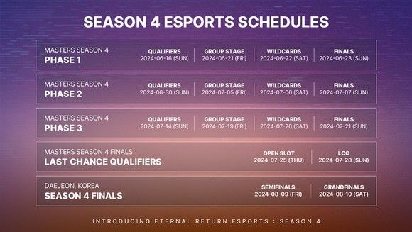 마스터즈 리그는 이터널 리턴의 최강자들이 우승을 두고 격돌하는 아시아권 오픈 리그이다. 총 3개의 페이즈를 거치며 서킷 포인트를 많이 모은 상위 10개 팀과 LCQ에서 좋은 기량을 보여준 2개 팀이 오는 8월9일 대전 드림 아레나에서 열리는 마스터즈 시즌4 파이널 참가 자격을 얻게 된다.