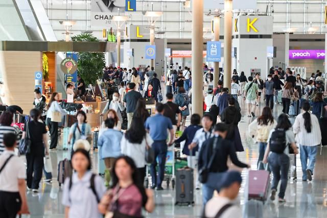 “显忠日”小长假期间,仁川机场迎来旅客出境旅游高峰。【图片提供 韩联社】