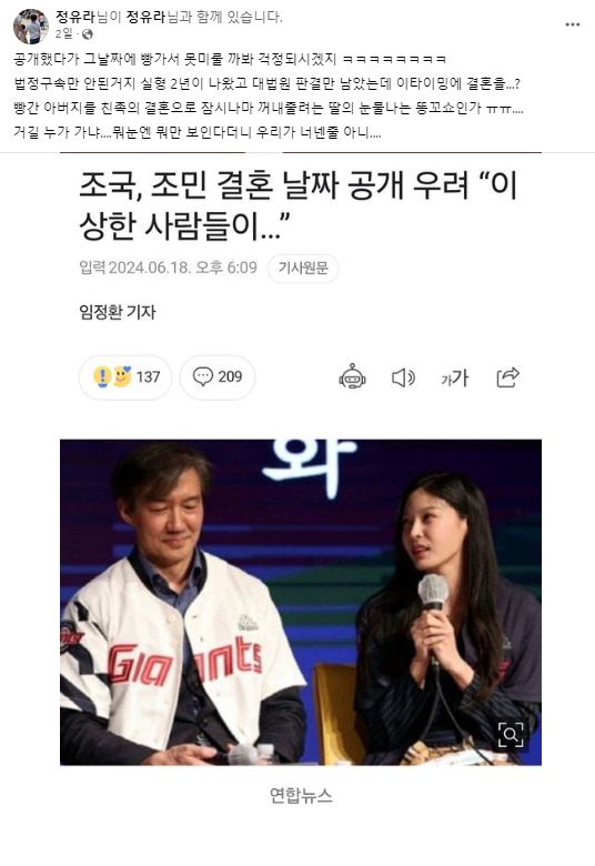정 씨는 지난 20일 자신의 사회관계망서비스(SNS)를 통해 "(조민 씨의 결혼식 날짜) 공개했다가 그 날짜에 빵(감옥) 가서 못 미룰까 봐 걱정되시겠지. (조국 대표가) 법정구속만 안된 거지 실형 2년이 나왔고, 대법원 판결만 남았는데 이 타이밍에 결혼을?"이라며 조 대표와 조 씨를 동시에 저격했다.