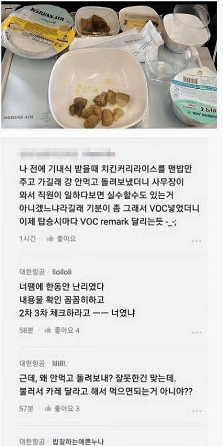 그러자 해당 승객이 등판했다. 이 승객은 "전에 기내식 박을 때 치킨 카레라이스를 맨밥만 주고 가길래 그냥 안 먹고 돌려보냈더니 사무장이 와서 직원이 일하다 보면 실수할 수도 있는 거 아니겠냐 하길래 기분이 좀 그래서 VOC를 넣었다. 이제 탑승할 때마다 VOC remark가 달리는 것 같다"며 대수롭지 않게 말했다.