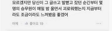 이어 "당신의 VOC 사건이 터지고 나서 매번 우리는 브리핑할 때마다 당신의 VOC가 브리핑 룸 화면에 올라온다. 서비스 아이템 누락하는 일 없도록 조심하자 매번 항상 화제가 됐었다"며 "당신이 아무 생각 없이 올린 VOC로 인해 몇 명의 인생이 뒤바뀐 건지 단 한 번이라도 죄책감을 느꼈으면 좋겠다. 얼마나 열받고 화가 나서 VOC를 쓴 건지는 모르겠지만 당신이 그걸 쓰고 발 뻗고 잤던 순간부터 몇 명의 승무원이 매일 밤 울면서 괴로워했는지 지금부터라도 조금이라도 느꼈으면 한다"고 지적했다.
