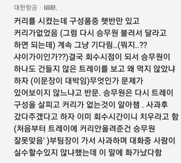 이 사건의 내막은 이렇다. 직장인 익명 애플리케이션 '블라인드'에 대한항공 직원이 "(승객이) 카레를 시켰는데 구성품 중 햇반만 있고 카레가 없었다. 그럼 다시 승무원 불러서 달라고 하면 되는데 계속 그냥 기다렸다. 결국 (그릇) 회수 시점에 승무원이 하나도 건들지 않은 트레이를 보고 '왜 먹지 않았냐'고 하자 (승객이) '무엇인가 문제가 있어 보이지 않느냐'고 반문했다. 승무원이 트레이를 살피고 카레가 없는 것을 보고 사과 후 갖다주겠다고 하자 회수 시간이니 치워달라고 했다. 나중에 부팀장이 가서 사과하며 사람이 실수할 수 있지 않느냐고 했는데 이 말에 화가 나 컴플레인을 걸었다"며 해당 사건의 전말을 전했다.