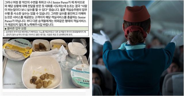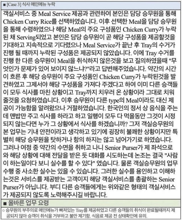 실제로 해당 승객이 대한항공 측에 보낸 컴플레인 내용도 공개됐다. 이 승객은 "맨밥만 주고 식사를 하라고 하고 일행이 모두 다 먹을 동안 그것이 시정되지 않는다면 누가 그 상황에서 식사를 하겠냐. 그저 객실 승무원의 본 업무는 기내 안전이라고 생각하고 있기에 굉장히 불쾌한 상황이지만 항의하지 않고 넘어가기로 했다"며 "그러나 여정 중 약간의 수면을 취하고 나니 부팀장이 좌석으로 와 해당 상황에 대해 전달받은 듯 대화를 시도하는데 '사람이 하는 일이다 보니 실수를 할 수도 있다'고 했다. 그러한 실수를 용인하고 이해하는 건 승객이지 부팀장이 아니다"라고 불쾌함을 표하고 있었다.
