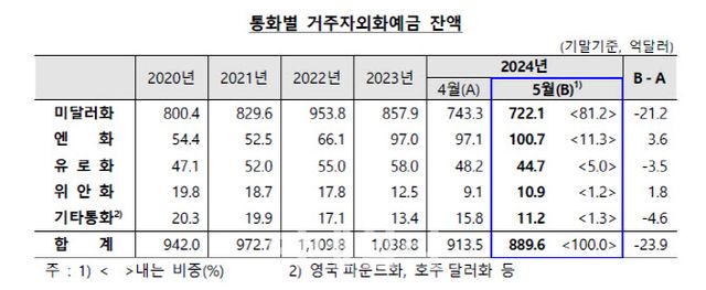 21일 한국은행이 발표한 ‘5월중 거주자외화예금 동향’에 따르면 외국환은행의 거주자외화예금은 5월말 889억6000만달러로 전월말 대비 23억9000만달러 감소했다. 다섯 달째 감소세다. 규모로는 2022년 8월말(882억7000만달러) 이후 가장 적다.
