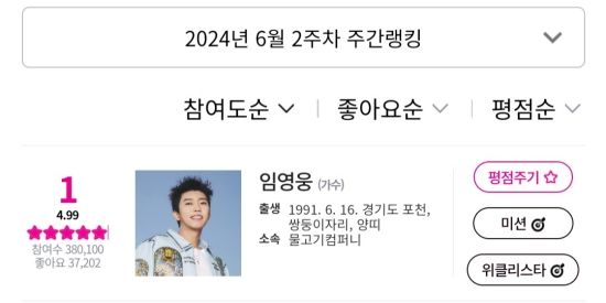 아이돌차트에 따르면 지난 6월 14일부터 6월 20일까지 집계된 2주 차 평점랭킹에서 임영웅은 38만 100표를 얻어 최다득표를 기록했다.