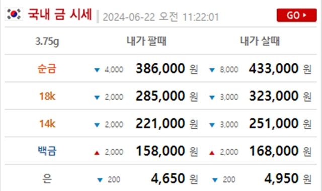순금(24K) : 매입가 43만 3000원 / 매도가 38만 6000원