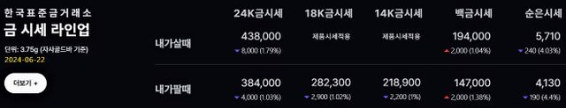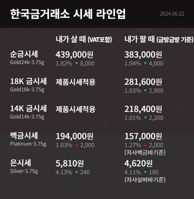 순금(24K) : 매입가 43만 9000원 / 매도가 38만 2000원