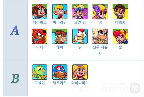 한편 터보 부츠 2개를 획득하는 닭과 벌을 소환하는 비, 당근을 캐내 전리품을 획득하는 메이비스 등이 A 티어를 획득했다. 또 무작위 마법을 주는 마법사, 치유 처냇을 배치하는 팸, 발사 속도 증가하는 중화기병 등이 A급에 했다. 가장 많이 보이는 캐릭터 중의 하나인 고블린과 엘프리모, 다이너마이크는 가장 낮은 B급에 속했다.
