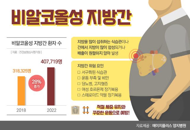 비알코올성 지방간의 한국인 유병률은 25~30%로 국민건강심사평가원에 따르면 비알코올성 지방간으로 병원에서 진료받은 환자가 2018년 31만8,325명이었는데 2022년에는 이보다 28%가량 증가한 40만7,719명으로 조사됐다.