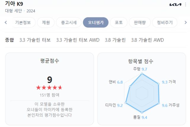 K9 오너 평가에는 총 151명이 참여했다. 그중 3.8 가솔린 AWD를 소유한 차주가 121명으로 80% 가까이 차지했고, 뒤이어 3.3 가솔린 터보 AWD(24명), 3.8 가솔린 2WD(9명) 순이었다. 평균 평점은 10점 만점에 9점으로, G80과 같고 G90보다는 0.2점 낮은 수치다.