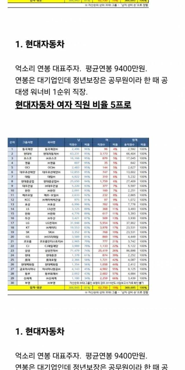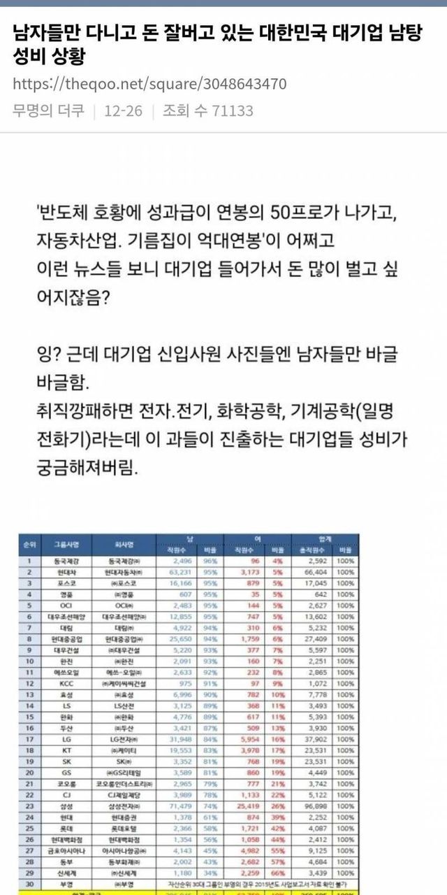 결론적으로 저 글에서 올린 대기업의 성비는 오히려 실제 전공자 성비랑 비교했을때 여자직원을 매우매우 많이 채용한거임. 차별 그런거 없음. 그냥 뽑고 나니까 남자인거임.