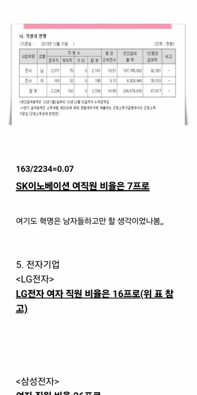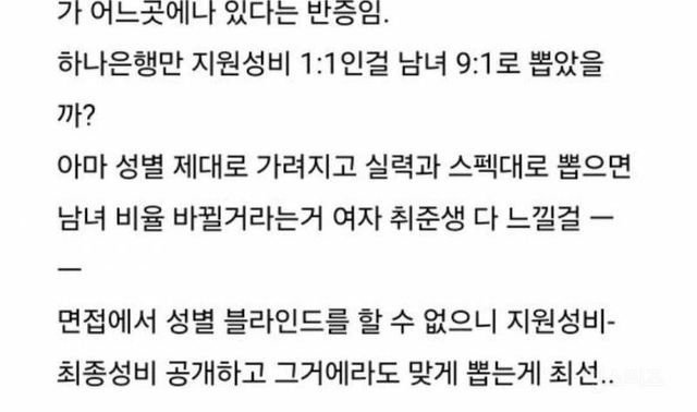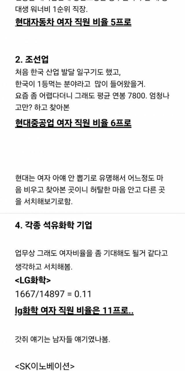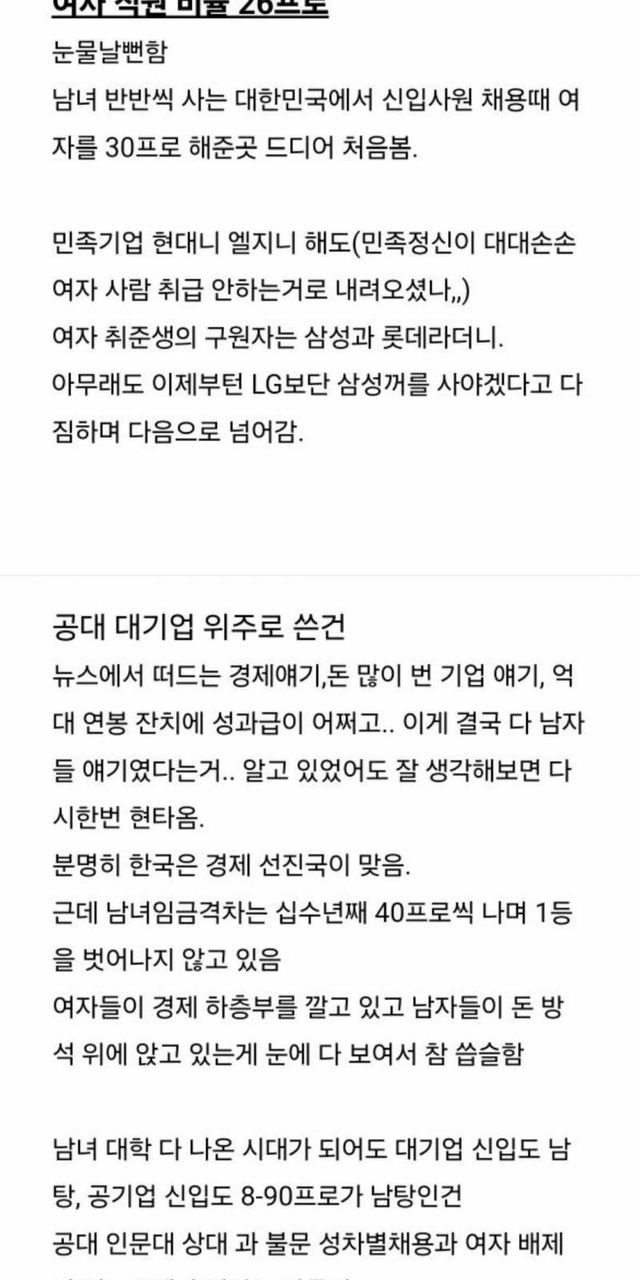 대충 삼성전자, LG전자같은 대기업에서 여자를 뽑지 않고 지나치게 남자만 편애한다면서 하소연하는 글이었음.