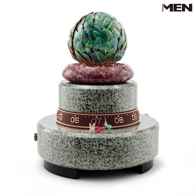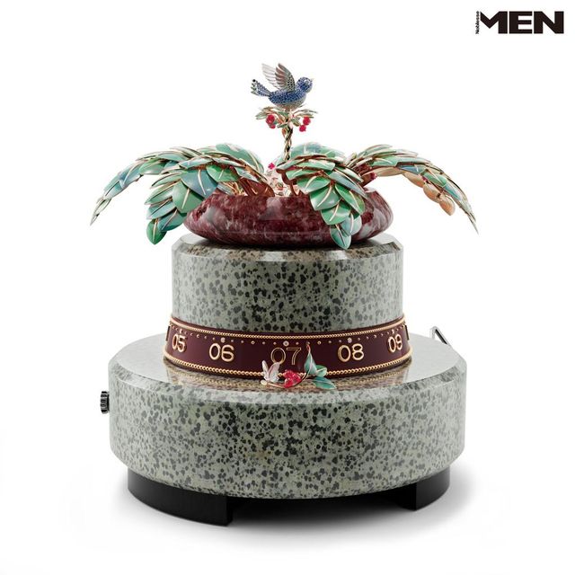 자연에서 끊임없이 영감을 받는 반클리프 아펠이 새로운 엑스트라오디네리 오브제 컬렉션을 공개했다. 아피리시옹 데 베 오토마톤의 첫인상은 비밀을 품은 듯한 풍성한 부케의 모습이다. 112개의 로즈 골드 잎사귀가 서로 겹치고 얽힌 형태를 띠며, 부케가 서서히 열리는 순간 화이트 골드와 다이아몬드, 사파이어 장식의 새가 날아오르는 장면을 생생하게 만날 수 있다. 이때 감미로운 멜로디도 함께 울려 퍼진다. 부케를 여닫는 회전 시스템은 메종 워크숍에서 자체적으로 개발했으며, 프랑수아 주노가 디자인한 메커니즘을 배치했다. 오토마톤의 베이스는 달마시안 재스퍼 구조물과 핑크 튤라이트로 제작한 볼로 구성했다. 8일간의 파워리저브를 제공하며, 전 세계에 단 하나 존재하는 피스다.