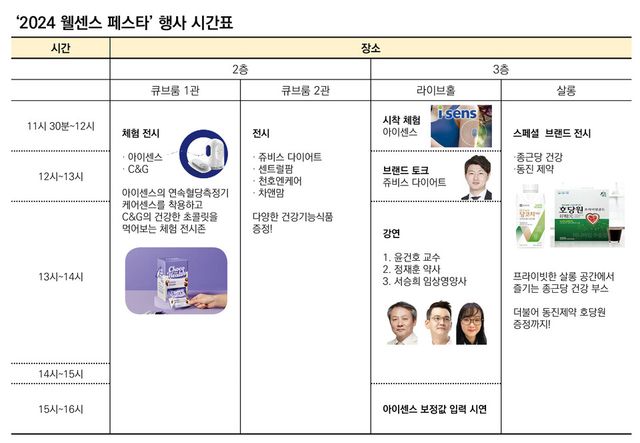 3층 라이브 홀에서는 11시 30분부터 아이센스 연속혈당측정기 시착 체험과 전문가들의 강연이 펼쳐진다. 사전신청자 가운데서 추첨된 50명은 국산 연속혈당측정기를 최초로 개발해 상용화한 아이센스의 '케어센스 에어(CareSens Air)' 시착 체험을 할 수 있다.