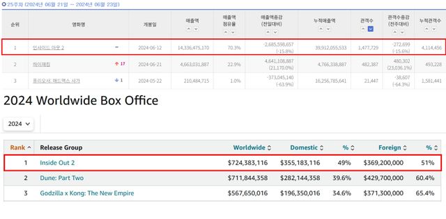 북미의 뜨거운 열기도 2주 차까지 이어지고 있다. 박스오피스 모조 추정치에 따르면 '인사이드 아웃 2'는 개봉 2주차 주말 흥행 수익 1억 달러를 기록하며 박스오피스 1위를 차지한 데 이어, 북미 누적 흥행 수익 3억 5518만 달러, 글로벌 누적 흥행 수익 7억 2438만 달러를 거둬들이며 2024년 북미 개봉작 중 가장 높은 수익을 거둔 영화에 등극했다.