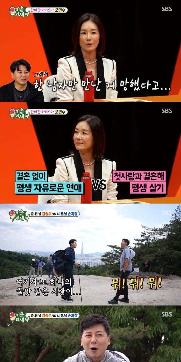 오연수는 "너무 일만 열심히 해서 다른 남자를 만날 새가 없었다. 그래서 첫사랑 한 남자만 만나고 결혼한 걸 망했다고 했다"라며 "두 아들들에게 결혼을 권장하지 않는다. 여러 사람을 많이 만나고 다양한 연애를 했으면 한다"라고 소신 발언을 해 눈길을 끌었다.