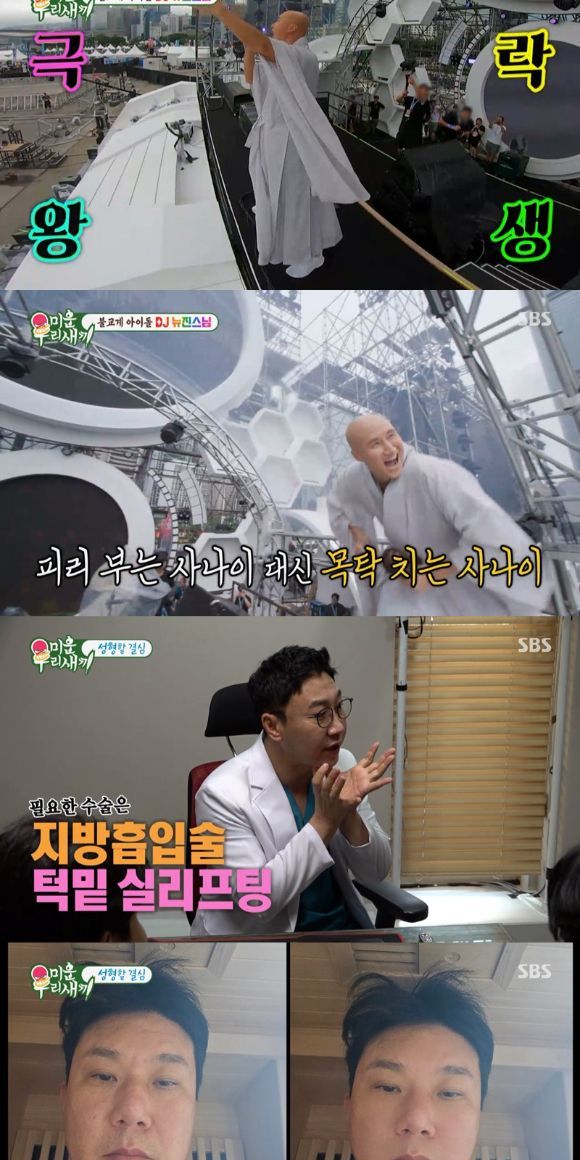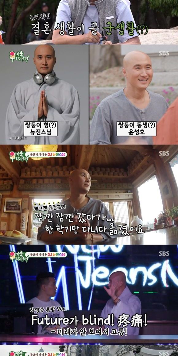 '불교계 아이돌 뉴진스님' 개그맨 윤성호의 일상이 공개됐다. 조계종에서 정식 수계 받은 법명 '뉴진스님'으로 활동 중인 윤성호는 사찰에서 108배를 마치고 스님들과 티타임을 가졌다. 불교 박람회 방문객의 80%를 2030 세대로 채우는데 일등공신한 뉴진스님의 무대에 대해 스님들은 "처음 봤을 때는 이게 뭔가 하고 멘붕이 왔다" "포교에 무척 좋을 것 같다"라며 칭찬을 아끼지 않았다.