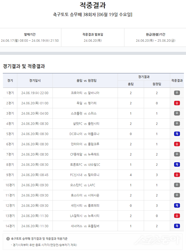 국민체육진흥공단에서 발행하는 체육진흥투표권 스포츠토토의 수탁사업자 스포츠토토코리아가 지난 19일(수)부터 20일(목)까지 진행된 유로2024 3경기 및 미국프로축구(MLS) 11경기 등 총 14경기를 대상으로 한 축구토토 승무패 38회차에서 1등 당첨자가 1명 발생했다고 24일(월) 밝혔다.