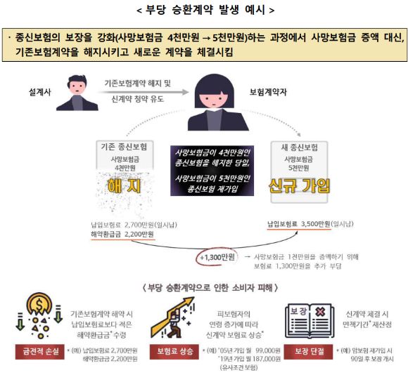금감원 관계자는 "보장 강화 권유로 기존 보험을 해지하고 새 보험에 가입하면 납부 보험료보다 적은 해약 환급금을 받거나 피보험자 나이 증가로 신계약 보험료가 오를 수 있으니 소비자 유의가 필요하다"라고 밝혔다.