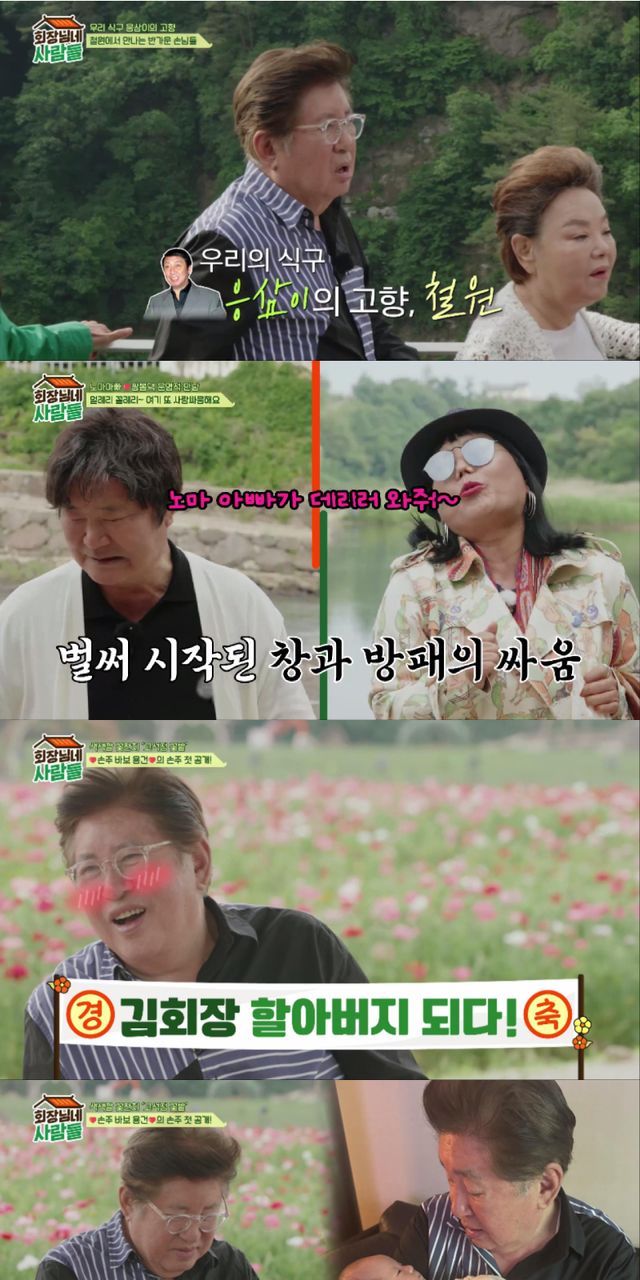 오랜만의 재회에 근황을 나누는 이숙과 전원 패밀리. 드라마, 연극, 가수 행사까지 쌍봉댁 전성시대를 맞아 눈코 뜰 새 없이 바쁜 나날을 보내고 있다는 이숙부터, 7년 만에 드라마에 복귀하는 복길 엄마 김혜정, 뮤지컬 ‘친정엄마’를 성황리에 마친 김수미까지 경사스러운 회장님네 근황이 전해진다. 특히나 최근 차남 김영훈, 황보라 부부의 득남으로 할아버지가 된 김용건에게 아낌없는 축하가 쏟아진다. 김용건은 “이쁘더라고”, “천사 같아”라고 하며 함박웃음을 지으면서, 사진을 보여주며 손주를 자랑한다. 사진을 본 김혜정이 보통 손주들이 한 대를 건너서 닮는다면서 “선배님(김용건)인데? 똑같아 완전”이라고 하고, 김수미 역시 “오빠, 입술이 크다!”라며 신기해하자 손주 바보 김용건은 감출 수 없는 기쁨과 흐뭇함을 보인다.