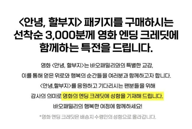 영화 패키지를 구매하는 선착순 3000명에게는 엔딩 크레딧에 이름이 올라가는 특전을 준다고 한다.