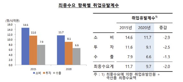 경제 성장에 필요한 노동 수요가 감소하고 있다. 특정 상품에 대한 최종 수요가 10억원이 발생할 경우 이를 생산하기 위해 필요한 직·간접적으로 유발되는 취업자 수, ‘취업유발계수’는 9.7명으로 뚝 떨어졌다. 2015년(11.7명)에 비해 2명이 하락했다.