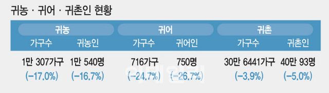 통계청은 25일 ‘2023년 귀농어·귀촌인 통계’를 통해 지난해 귀농가구가 전년 대비 17% 감소한 1만307가구를 기록했다고 밝혔다. 같은 기간 귀어가구는 24.7% 줄어든 716가구, 귀촌가구는 3.9% 감소한 1만2328가구로 집계됐다.