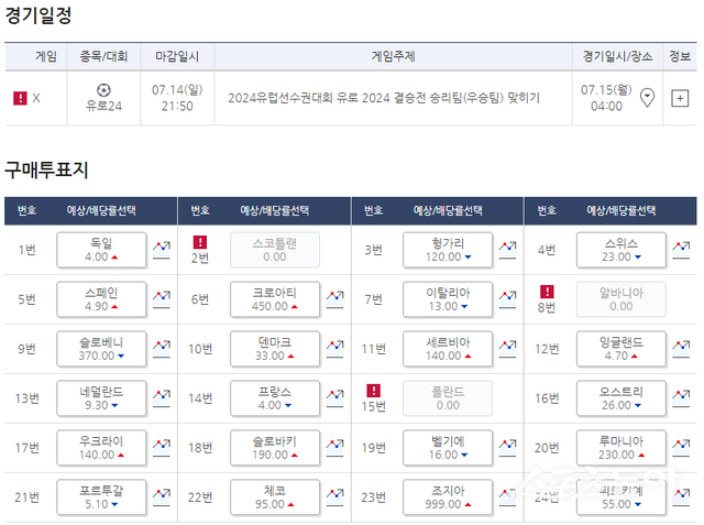 이번 게임은 최소 100원부터 참여가 가능하고, 한 국가만 선택해도 구매를 완료할수 있기 때문에 스포츠토토 초심자들의 구매가 이어지고 있다. 현재 24개국 중 스코틀랜드, 폴란드, 알바니아 등 3개국의 탈락이 확정되면서 선택지는 21개국으로 좁혀진 상황이다.